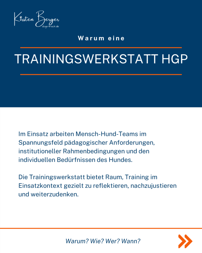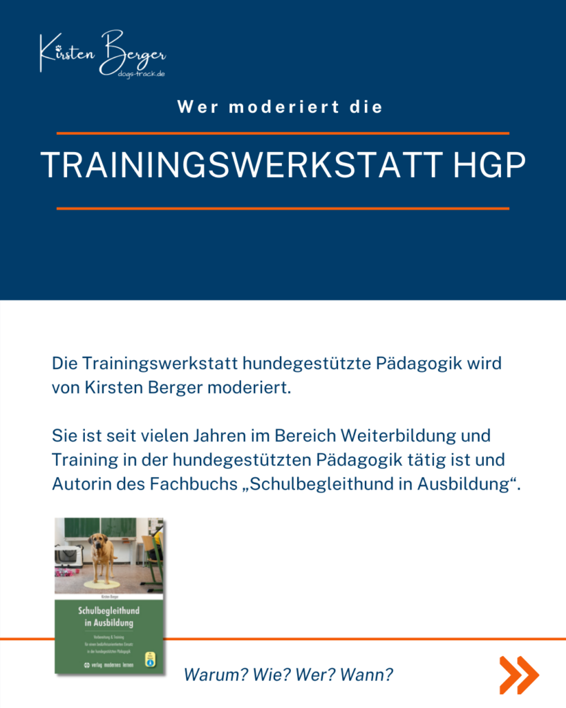Die Trainingswerkstatt HGP wird von Kirsten Berger moderiert. Sie ist seit vielen Jahren im Bereich Weiterbildung und Training in der hundegestützten Pädagogik tätig und Autorin des Fachbuchs „Schulbegleithund in Ausbildung“.